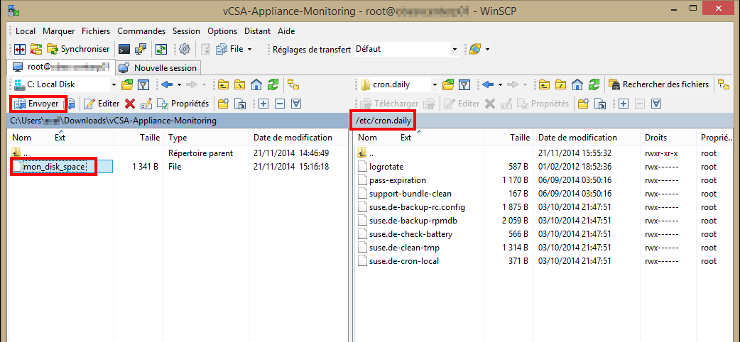 Avec WinSCP, connectez-vous à votre appliance en utilisant le protocole SCP (utilisez le compte root avec votre mot de passe personnalisé). La partie droite affiche l’arborescence de votre appliance. Positionnez-vous dans /etc/cron.daily (ou /etc/cron.weekly si vous préférez une exécution hebdomadaire). La partie gauche affiche l’arborescence de votre machine. Positionnez-vous dans le dossier où se trouve votre script paramétré.